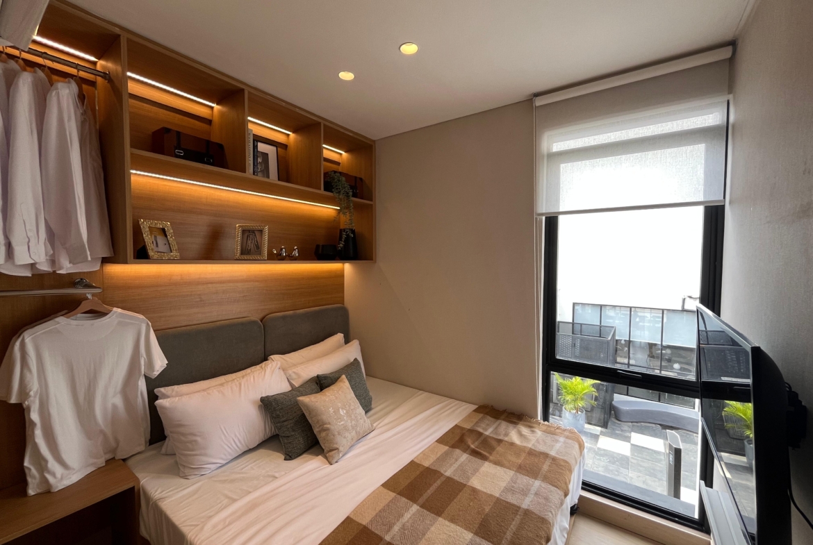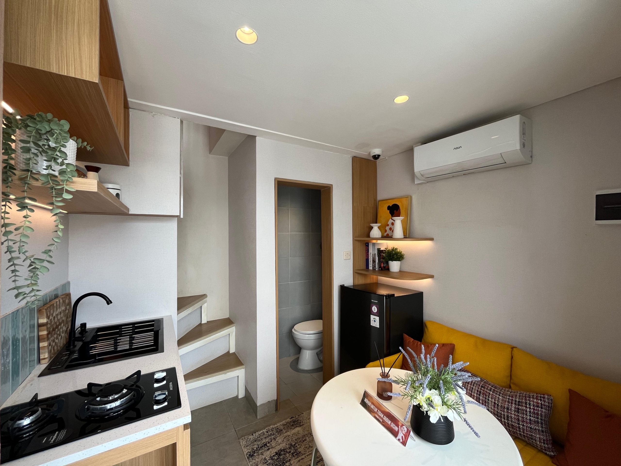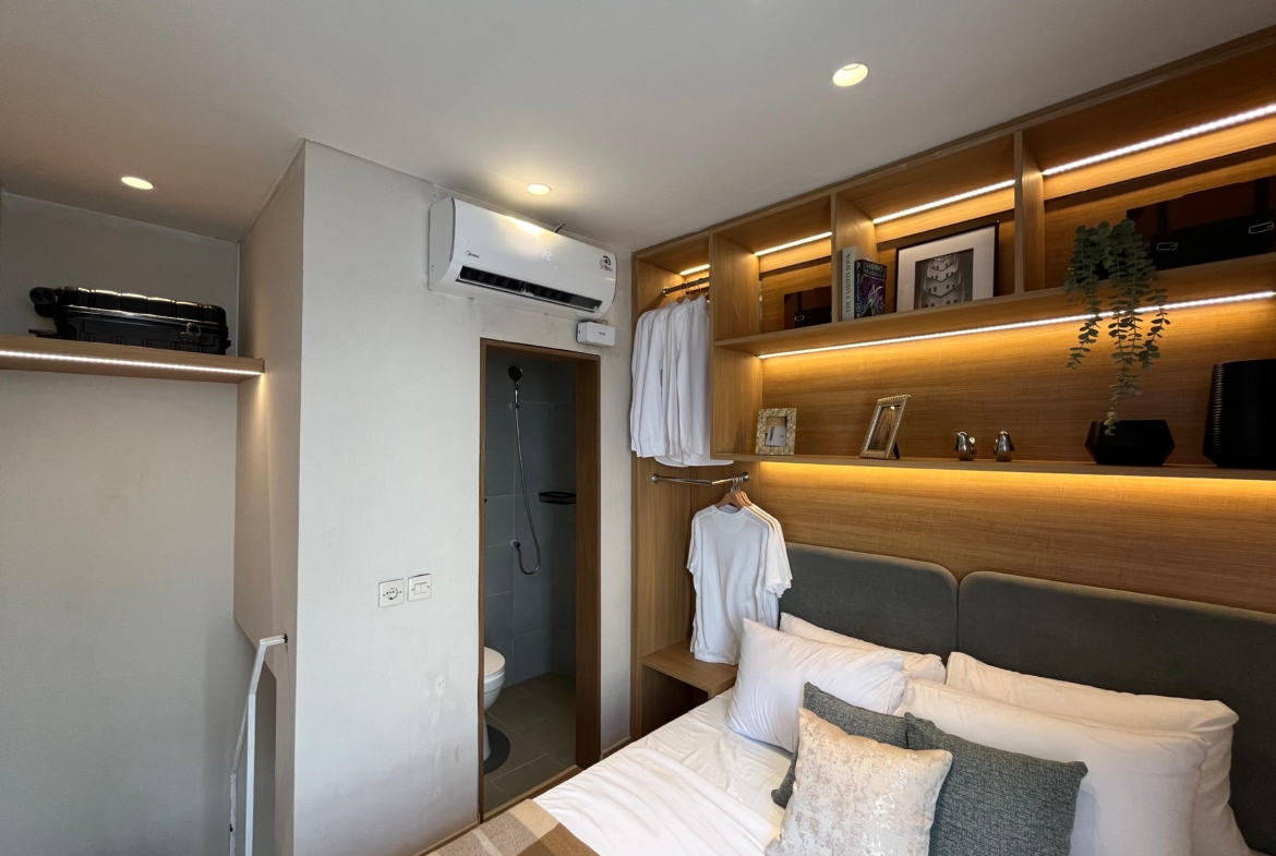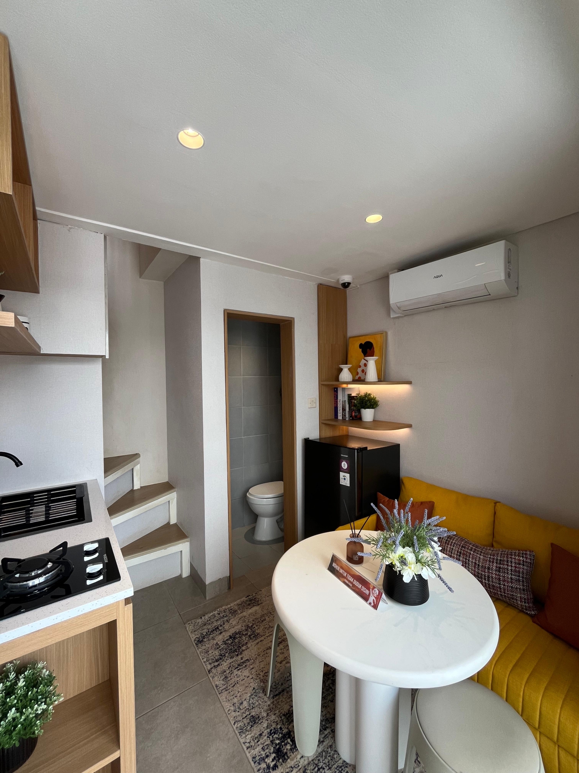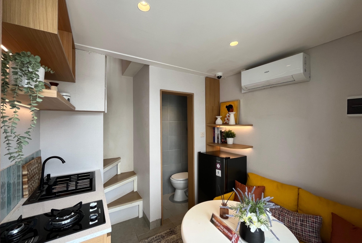 Tata ruang yang efisien memadukan area tinggal, bekerja, dan beristirahat tanpa saling mengganggu. Pencahayaan besar dan penataan furnitur minimalis memberi ruang bagi kreativitas berkembang meski di dalam hunian berukuran mungil.