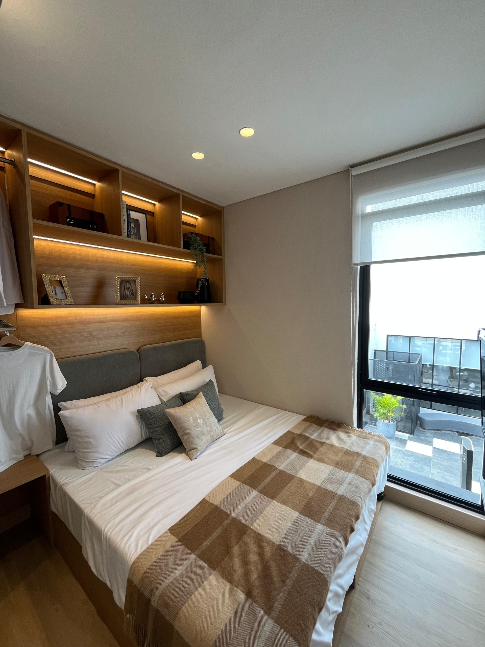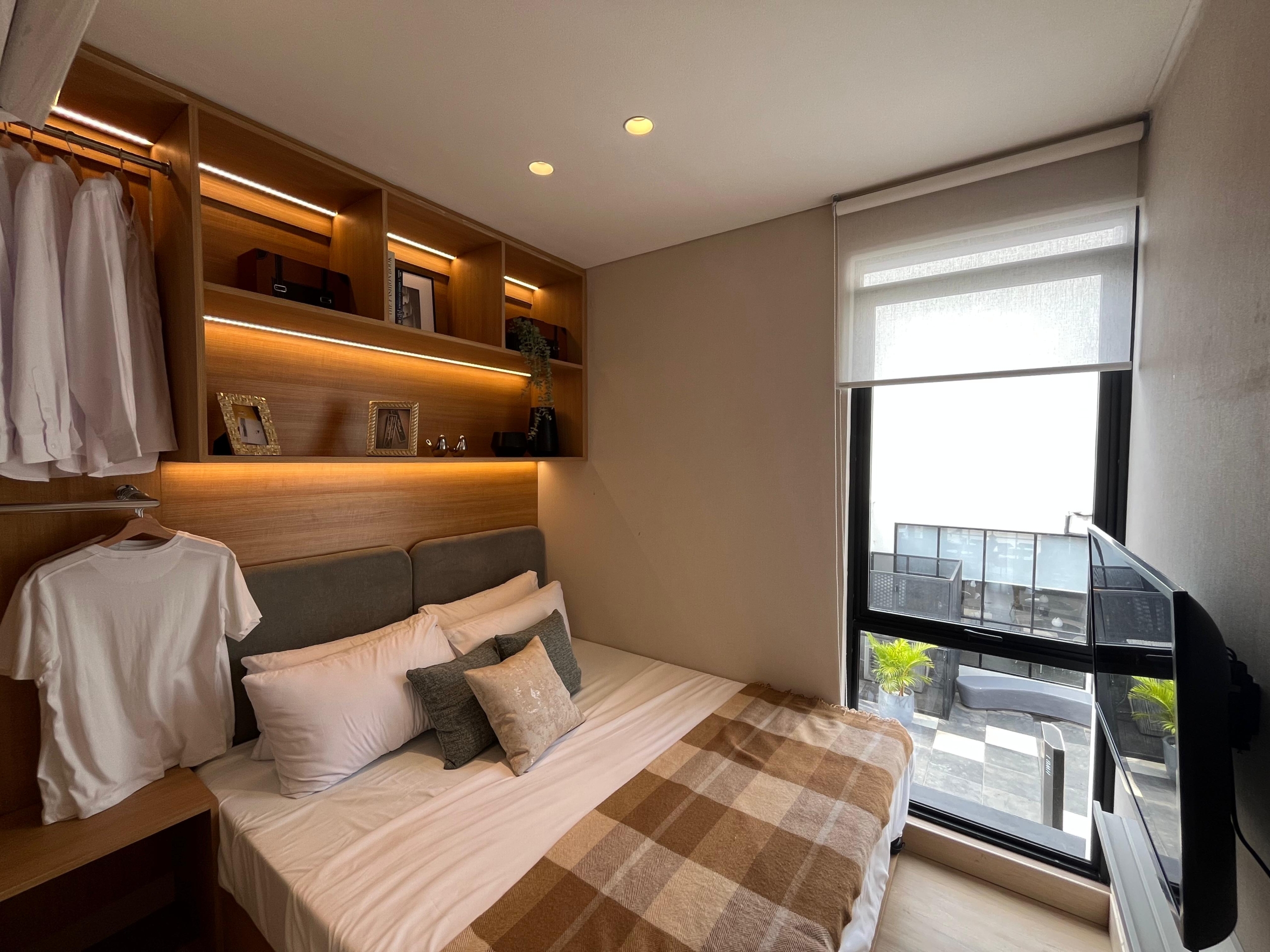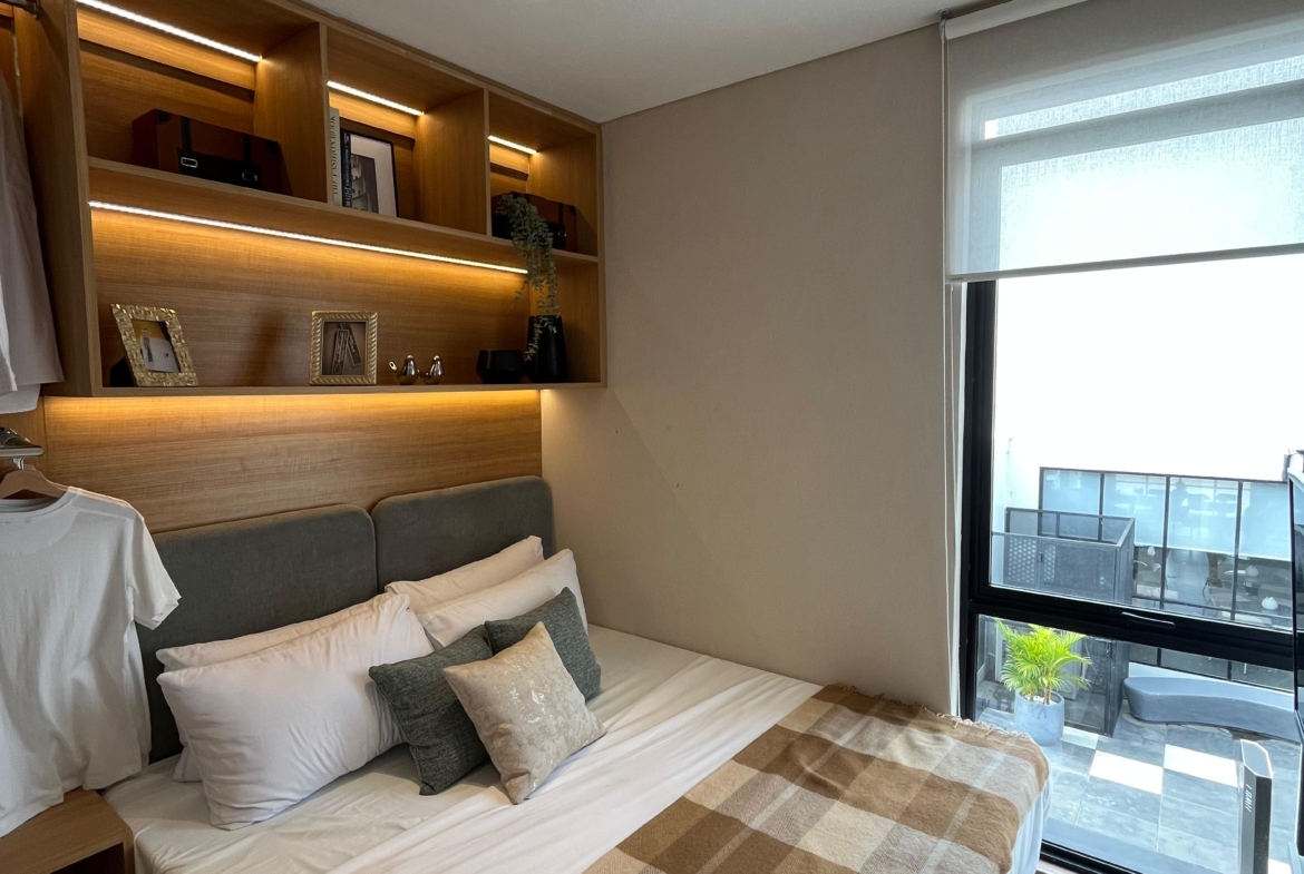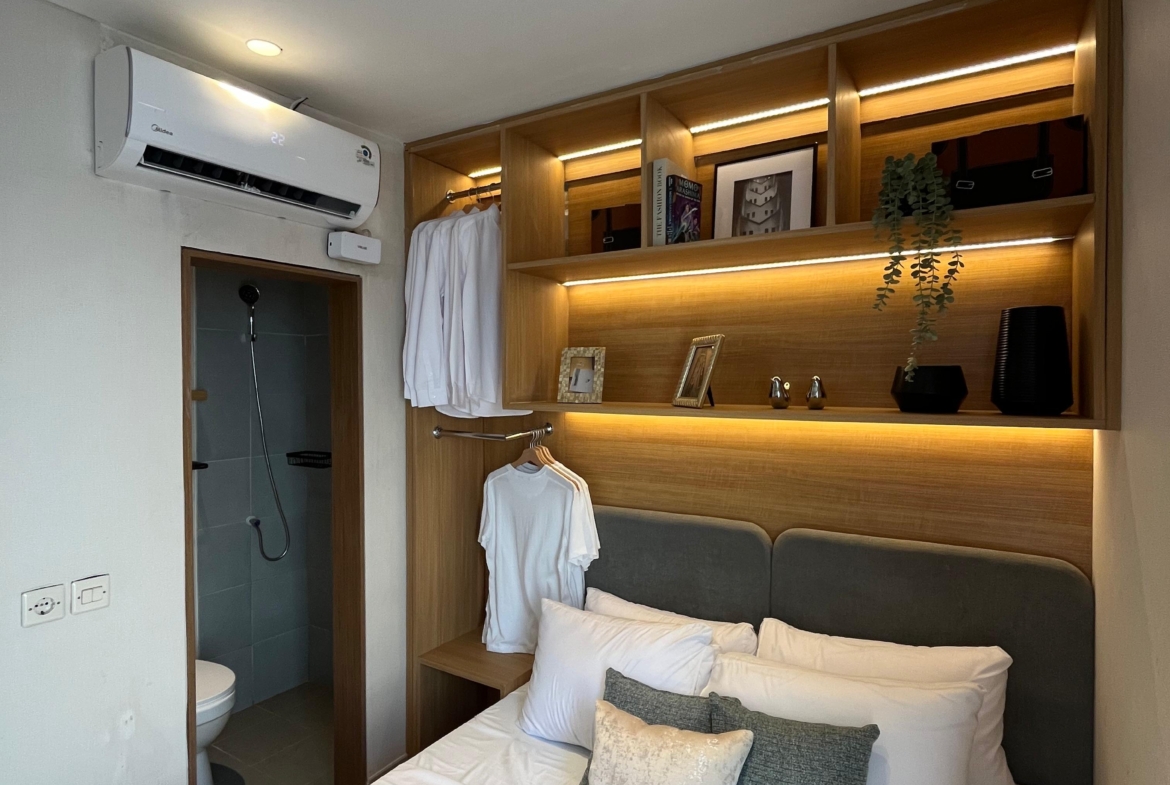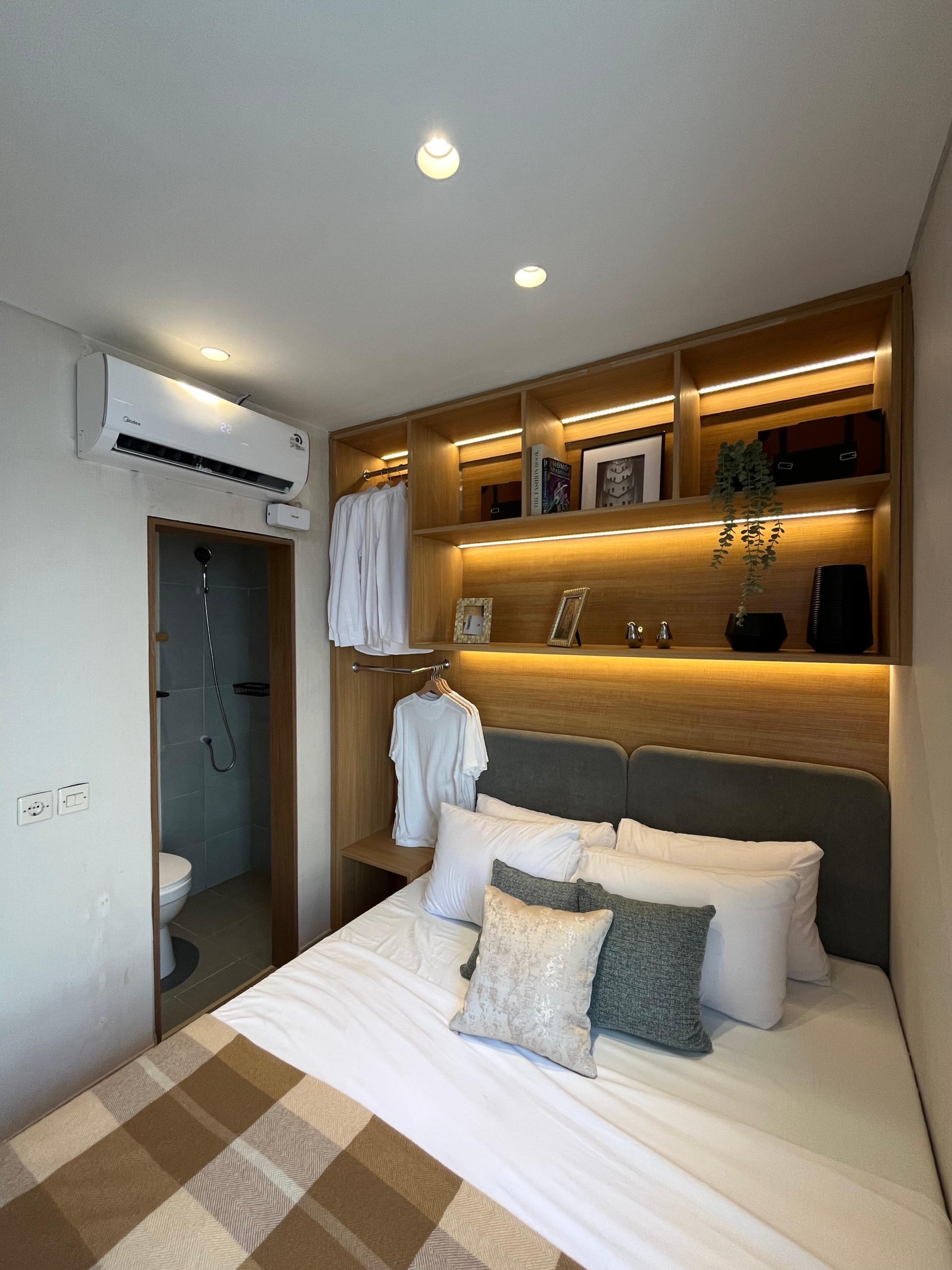 Tata ruang yang efisien memadukan area tinggal, bekerja, dan beristirahat tanpa saling mengganggu. Pencahayaan besar dan penataan furnitur minimalis memberi ruang bagi kreativitas berkembang meski di dalam hunian berukuran mungil.